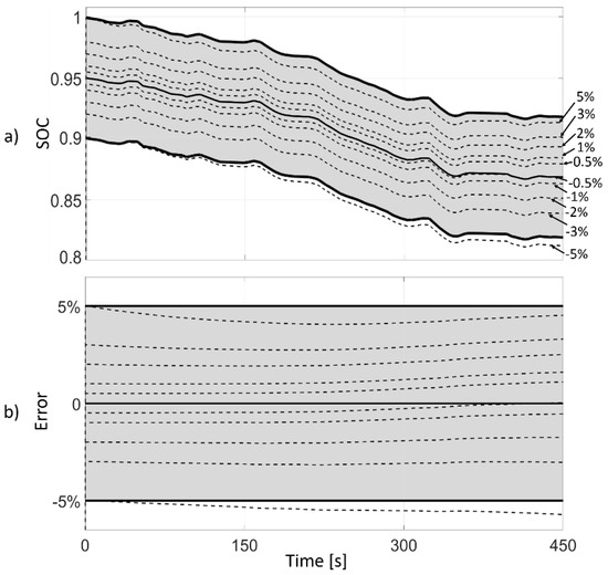 Robustness analysis to the initial SOC estimation inaccuracies. (a) Estimation output with error on the initial SOC ranging from to . (b) Error between the expected and the estimated SOC. In both plots, the grey area indicates the error tolerance region of . The solid lines represent the expected SOC and the two tolerance thresholds. The dashed lines are the SOC estimations.