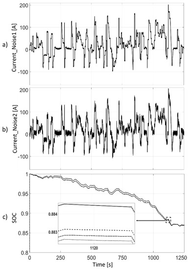 The second analysis is conducted by disturbing the measurement of the current provided as input to the network. Two different types of noise are summed up in the current profile of Figure 9: A 1 kHz pseudo-random Gaussian noise having zero mean value and standard deviation equal to 1.5 A (type 1, Figure 11a) and a 100 Hz pseudo-random Gaussian noise having zero mean value and standard deviation equal to 5 A (type 2, Figure 11b). The results are reported in (Figure 11c), where the solid line is the expected value, the dashed line is the estimation without noise and the dash-dotted and dotted lines are the estimation affected by the type 1 and type 2 noise, respectively. The results show that the estimation performance is not affected by problems of noise on the current measurement, which is typically the most disturbed signal in the real applications. Obviously, the ANN does not have the capabilities to effectively compensate possible inaccuracies in the offset and gain calibration of the current sensors.