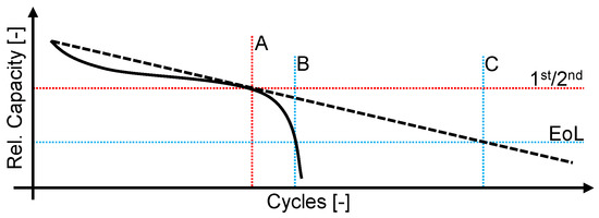 Figure 1 shows this interaction. For both ageing curves, idealised linear (dashed line) and non-linear (solid line), the transition between first and secondary application (1st/2nd) is based on the remaining capacity and shown in red. The EoL is again based on the capacity is shown in blue. Compared to the linear degradation (A to C), the cycle count for the second-life is much smaller in case of non-linear ageing behaviour (A to B) because of the increased capacity fade associated with the sudden-death effect.