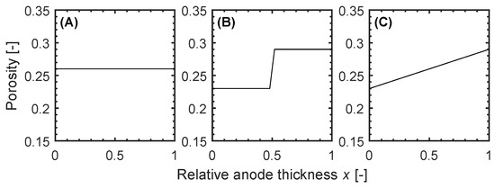 Figure 2 shows the three different porosity profiles considered in this work. Each sub-figure shows the porosity throughout the anode, from the current collector on the left side