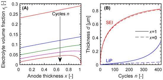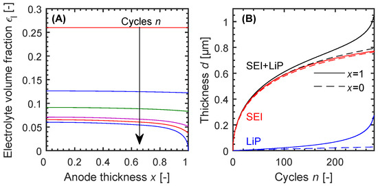 and thereafter it appears to be exponential. At around 230 cycles, the curvature of the discharge capacity graph changes, there is an inflection point and the degradation per cycle increases again. A change in curvature can also be seen in the total film thickness, with a strong change at the separator side. It can be concluded, that continuous formation of SEI reduces the porosity. As soon as the reduction of porosity advances beyond a certain stage, if it falls below 4% in this case, lithium plating at the separator side increases significantly until ion transport is completely prevented. Because of the inhomogeneity between the two sides of the anode, both modified porosity profiles will counteract the increased layer growth with an increased initial porosity at the separator side of the anode.