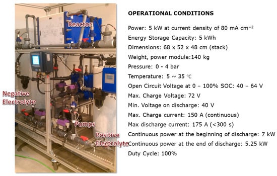 The stack employed in this work, shown in Figure 2, is a commercial product provided by Golden Energy Fuel Cell Co. Ltd. (Shuozhou Shanxi, China) and consists of 40 individual cells connected hydraulically in parallel by a network of internal distribution manifolds and electrically connected in serial by bipolar electrodes, with the positive of one cell becoming the negative of the next cell, with an average output power of 5 kW, at the charge–discharge current density of 800 A m−2 (equivalent to 100 A). Auxiliary equipment and the hydraulic system have been designed and installed allowing us to achieve the most adequate battery operative conditions (i.e., variable flow rate, electrolyte conductivities and redox potential monitoring…). Attached to these current collectors were porous graphite felts with an active area of 1800 cm2 (36 cm in width and 50 cm in length) for each felt electrode with 7.0 mm thickness (20% compression) and a stated surface area of 0.4 m2g−1. The membrane was Nafion type (Model 117, DuPont, Midland, MI, USA) meanwhile the flow frame used in the stack consists in a zigzag configuration with primary and secondary paths constituting multi-distribution channels. The design details for this stack have been extensively outlined by Wu et al. [].