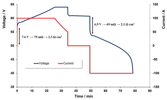 - After fully charging of the battery (100 A CC-CV up to 64 V, cut-off current of 50 A), it was discharged to 35% SOC at a nominal constant current rate (800 A m−2).