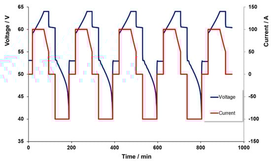 Voltage and current profiles for several charge and discharge cycles at 100 A.