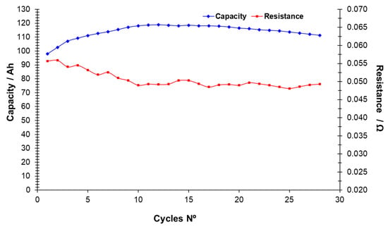Capacity and internal resistance (right axis) as a function of the number of cycles.