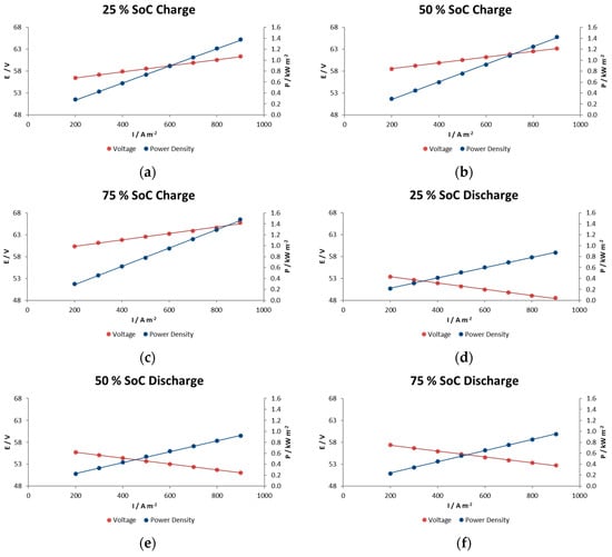Figure 9a shows the relationship between the charge level and the OCV and illustrates what would be expected from the Nernst equation being applied to the stack reaction; a linear evolution with the SOC, with a narrow range of voltage, from 60 to 54 V in a range of SOC of 80 to 15%. At the lower limit, a state of charge 20%, it is observed from the figure that the OCV starts to decrease rapidly. A rapid increase would also have been observed beyond an 85% state of charge.