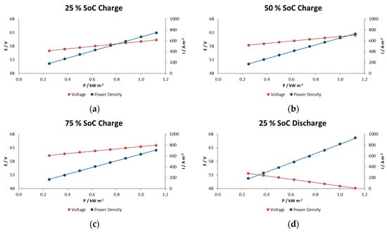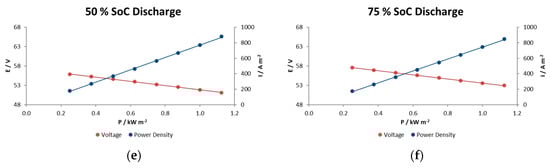 The results in Figure 9b indicate a relatively high power capability at 1.38–1.49 kW m−2 maintaining a reasonable voltage during the 30 s, performance a bit beyond the typical values of Vanadium redox flow batteries (1 kW m−2) [], although commercial systems utilizing high performance electrodes reported values of 1.5 kW m−2 [] and achieving 5.57 kW m−2 in the case of the highest instantaneous value at 60% SOC obtained so far [].