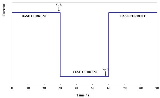 The peak power test consists of performing 10 pulses at 10 states-of-charge, from 100% to 10% SOC in 10% intervals, during a single discharge. These SOC values are achieved by successively discharging the battery from a fully charged state to each % of SOC. At each specified SOC, the battery is discharged for 30 s with a current of 112.5 A or current density of A m−2. Figure 8 illustrates this sequence of steps. The same current values are used at all SOC levels.