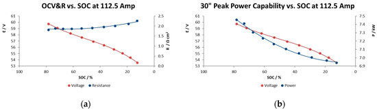 Peak power capability test. (a) Open circuit voltage vs. SOC and (b) power capability vs SOC.