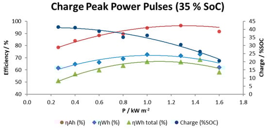 Results obtained indicate that total energy efficiency is dependent on the power rate in such a way that high and very low power requirements cause a decay in global energy efficiency to values around 50–60%. However, it is possible to maintain a moderate global energy efficiency above 63% in a range between 0.8–1.4 kW m−2. As the charge rate was increased, the amount of real charge available for use was progressively lower from 42% SOC at 0.3 kW m−2 to 21% SOC at the highest charge rate 1.6 kW m−2.