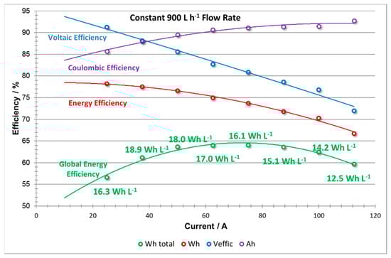 Efficiencies vs current: coulombic efficiency; voltage efficiency; stack energy efficiency; battery energy efficiency including pumping energy losses, at constant flow rate (900 L h−1).