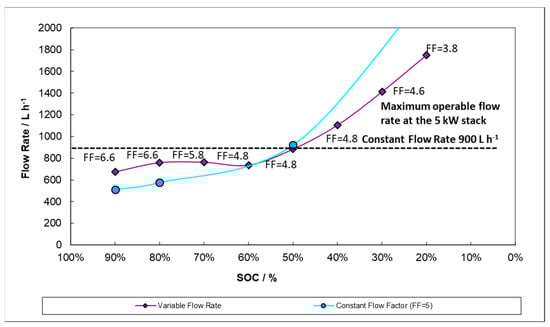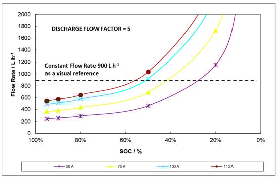 We believe that the theoretical variable flow rate could be tuned to cater to the necessities at different zones of the SOC and, even more critically, at different steps—charge versus discharge. For example, by working below a constant flow factor of 5 under certain conditions, such as at the end of the discharge, the final SOC can be adjusted by decreasing the flow factor (i.e., the flow rate) and forcing a premature discharge voltage cut-off. This is graphically described in Figure 13 which shows the volumetric flow rate evolution at different SOCs for a 100 A discharge. Again, a line corresponding to 900 L h−1 flow rate equivalent to the constant flow procedure is also included for purposes of comparison. The plot in Figure 13, describes a model of system behavior. There is a maximum operable flow rate (plotted at 1200 L h−1) determined by the manufacturer which the model can surpass but along which experimental flow rates may only taper. Therefore, the high output capability at low SOC suggested in the model below has not yet been achieved.