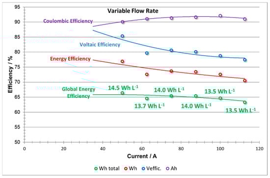 Efficiencies vs current: coulombic efficiency; voltaic efficiency; stack energy efficiency; battery energy efficiency including pumping energy losses, at variable flow rate.