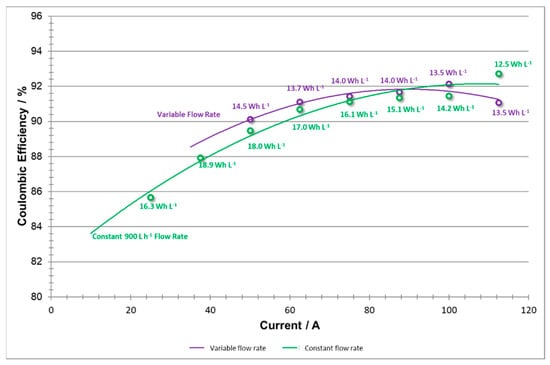 When comparing the coulombic efficiency curves for both sets of experiments (Figure 15), it should be noted that the shapes of both curves are very similar. A Coulombic efficiency curve is expected to show a slight decay to the right of its peak (where very high currents are demanded), and strong decay to the left []. However, it should also be noted that the drop in capacity at low current densities is more significant in the constant versus the variable flow rate data. This indicates that at low current densities, by applying 900 L h−1 one may cause a slight over pumping of the system, where the extra reactant does not need to be employed. By utilizing a variable flow rate method, the system can improve slightly the Coloumbic efficiency and save energy by applying an adequate lower flow rate at lower current densities.