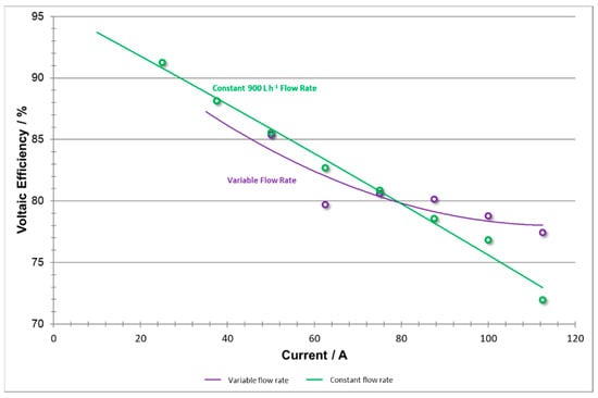 Voltaic efficiency (shown in Figure 16) generally exhibits a negative linear trend with respect to current, as shown by the constant flow rate data []. However, when the variable flow rate experiment was implemented, voltaic efficiency values were not constrained to follow this consistent downward trend. Instead, at high current densities, the data shows positive concavity. This may be explained by adapting flow rate to meet the system reaction demand which avoids concentration polarization. High coulombic efficiencies using low flow rates were also reported by Joerissen et al. [].