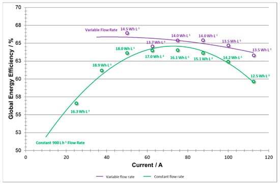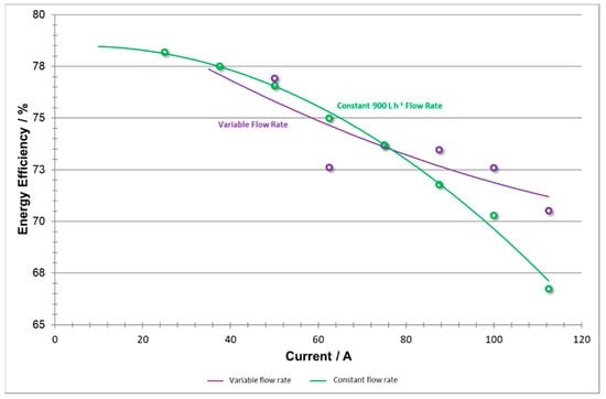 Energy efficiencies vs current at variable flow rate and constant flow rate.