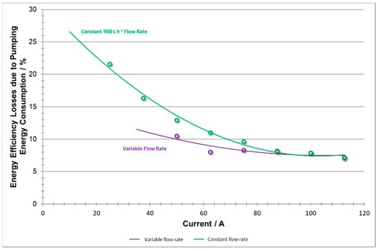 Battery energy inefficiencies including pumping energy losses vs current at variable flow rate and constant flow rate.