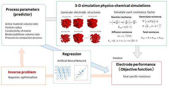 Figure 1 illustrates the proposed prediction and optimization scheme for a Li-ion battery porous electrode. In the first step, a high-throughput physico-chemical model, based on particle-aggregated structures, is developed and the database of the relationships between the process parameters—including particle volume fraction, particle radius, and so on—and the battery performance (represented by charge/discharge specific resistance) is constructed. In the second step, the regression model is developed in order to predict the charge/discharge specific resistance, using process parameters as predictors through an ANN. The optimized electrode structures and the process parameters are found by Bayesian optimization in the final step.