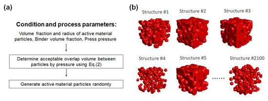 (a) Flowchart for the generation of the artificial structure with controllable process parameters, and (b) the generated mesoporous structures of the electrode (50 × 50 × 50 µm3).