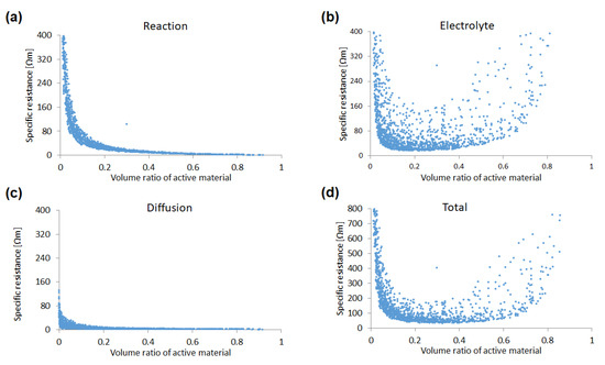 Sensitivities of (a) reaction resistance, (b) electrolyte resistance, (c) Li diffusion resistance, and (d) total specific resistance to the volume ratio of the active material, with a total of 2100 simulation results.
