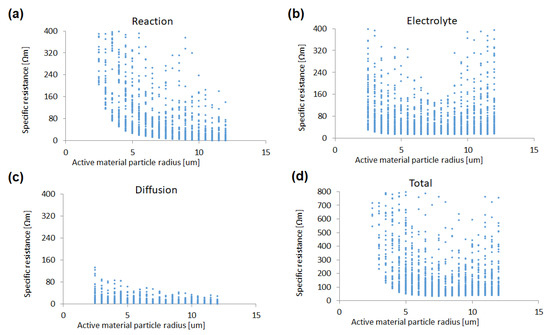 Sensitivities of (a) reaction resistance, (b) electrolyte resistance, (c) Li diffusion resistance, and (d) total specific resistance to the radius of the active material, with a total of 2100 simulation results.
