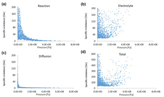 Sensitivities of (a) reaction resistance, (b) electrolyte resistance, (c) Li diffusion resistance, and (d) total specific resistance to the pressure, with a total of 2100 simulation results.