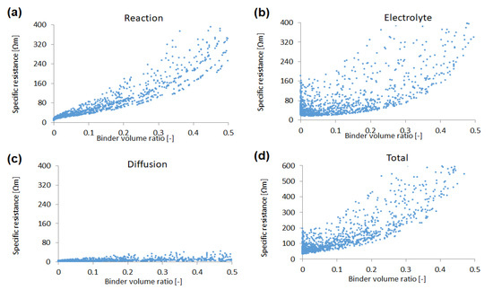 Sensitivities of (a) reaction resistance, (b) electrolyte resistance, (c) Li diffusion resistance, and (d) total specific resistance to the binder/additives volume ratio, with a total of 2100 simulation results.