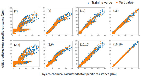 Scatter plots between the specific resistances calculated by the simplified physico-chemical models and predicted by various artificial neural network (ANN) models with training data and test data.