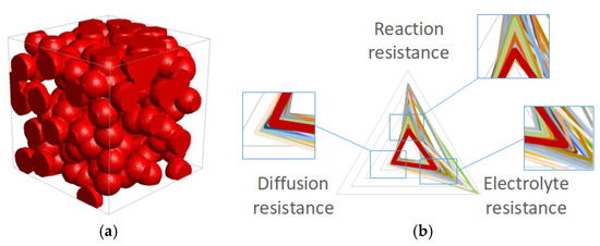 (a) Packing structure of the active material particles (50 × 50 × 50 µm3), and (b) radar chart of each specific resistance factor in the condition of the optimized process parameters.