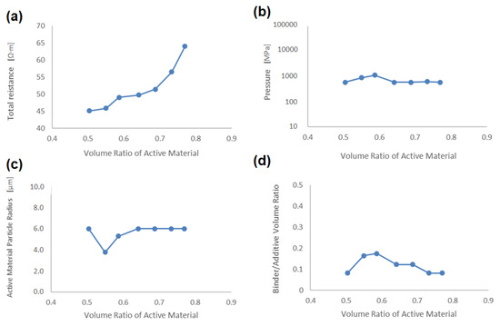 Dependence to the volume ratio in the active material of (a) total specific resistance, (b) pressure in the compaction process, (c) active material radius, and (d) binder/additives volume ratio.