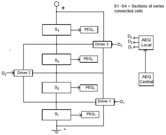 The 4 sections, S1–S4, have the following capacities: AH1 = 81 Ah (−10%) and AH2 = AH3 = AH4 = 90 Ah. A weak section at S1 or S4 is the worst case, since it can only be fed from one direction. Three AEQ drivers (A, B, and C) are required to transfer the charge from S2–S4 into S1 since it is the weakest section. The PEQs are not used during the discharge since they cannot transfer the charge to a cell.