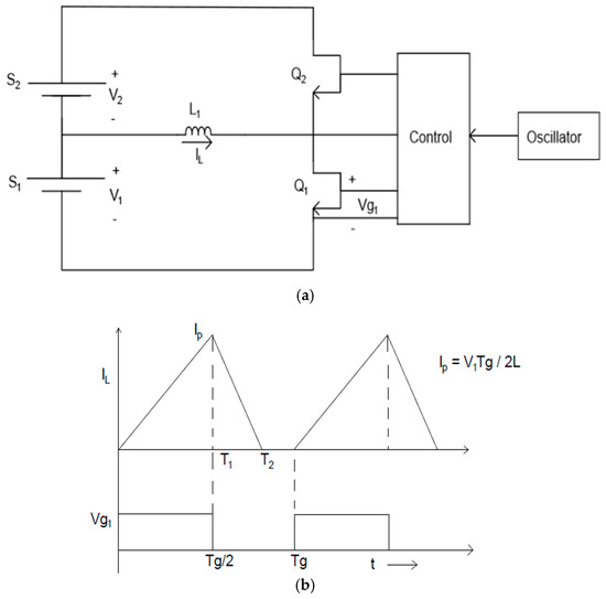 Basic inductive AEQ driver and waveforms. (a) Inductive AEQ driver connected to battery sections S1 and S2. (b) Inductor current, IL, and Q1 gate drive waveforms.