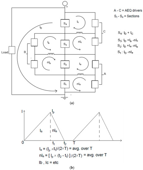 Figure 4a shows all of the loop currents for sections S1 to S4 and AEQ drivers A to C. Since the section voltages are DC, only the DC components of the AEQ currents can transfer any average energy. Figure 4b shows how Ia and η × Ia can be calculated from the Ia waveform. Because of losses, the current exiting an AEQ driver is reduced by a factor, η, e.g., the current into A = Ia and the current out of A = η × Ia (all section voltages are approximately the same). η will be called the AEQ efficiency. The total currents through S1 to S4 are also shown in Figure 4a.