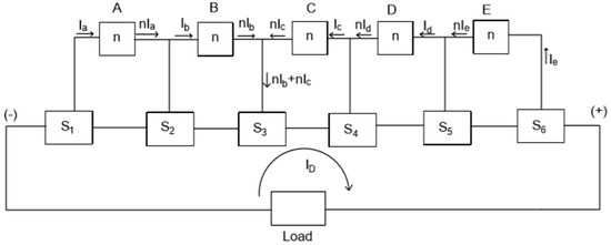 The following examples show how the required AEQ equalization currents in the BEQ can be calculated for a specific design as illustrated in Figure 4. This calculation was first introduced in [22,23], but the procedure and the results are explained here in more detail. Although the analyses in these previous references was correct, the derivation procedure for the AEQ equations needed further clarification. This analysis has been enhanced through the use of AEQ flow diagrams such as that in Figure 5 which shows how the AEQ currents flow between the battery sections and the AEQ drivers. These flow diagrams indicate the directions of the AEQ currents, but they are not exact equivalent circuits since they do not have the same topology as the actual circuit. The proper directions for the currents are usually obvious, but if the wrong direction is assigned, the calculated current will have the correct magnitude but a negative value. Although the BEQ can be operated as a voltage EQU while the battery is at rest, the intent here is to operate as a capacity EQU, so it is assumed the battery is active, and several transfers can take place simultaneously.