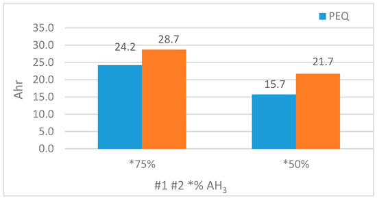 Next, a full discharge at ID = 7 Adc was done with the BEQ on, but the discharge capacity was only 21.73 Ah. This is considerably less that the calculated maximum of 27.29 Ah, which required an average AEQ current of 2.42 Adc. Therefore, the actual maximum value of 1.9 Adc is too low to achieve maximum capacity, but it is still 42.3% above the 15.27 Ah without the BEQ. The results are summarized in Table 1, and a comparison of the Ah capacities of the PEQ and BEQ are shown in Figure 9.