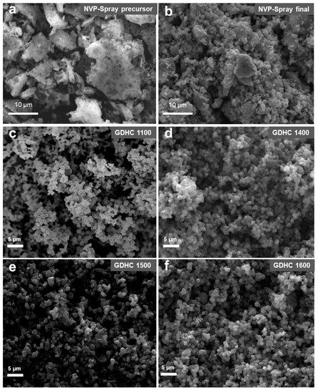 SEM image of the NVP-spray precursor (Figure 1a) reveals a holey morphology. Particles have varying sizes and shapes, but some plate-like structures with rough edges can be seen. The heat treated NVP-spray consists of much smaller particles (Figure 1b) with a varying size distribution. Particle size distribution can be narrowed by combining an ultrasonic spray method that ensures a constant flow of droplets with a similar size and an electrostatic or cyclone collector to separate different fractions. GDHC 1100 and 1400 in Figure 1c,d consist of smooth interconnected spherical particles with diameters around 400–500 nm. However, GDHC 1500 and 1600 in Figure 1e,f appear to be made of slightly larger interconnected and asymmetric particles. It can be concluded that heat-treatment temperatures (HTTs) above 1400 °C cause more pronounced structural changes to the primary particles formed during hydrothermal carbonization (HTC).