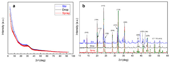 X-ray diffraction (XRD) data in Figure 2a indicates that the formed precursors are amorphous by nature because no sharp peaks can be observed. However, after heat treatment all samples contain the Na3V2(PO4)3 phase (Figure 2b). The NVP-drop and NVP-spray do not contain impurities and the intensities of the XRD peaks match the diffractogram from the database. NVP-stir has many unidentified peaks in the pattern, which are probably caused by the inhomogeneity of the viscous stir precursor during the last stages of heating. As water is evaporated from the mixture, the citric acid in the mixture turns the solution into an amorphous and sticky mass, which creates a temperature gradient in the mixture. This can result in heterogeneous distribution of elements in the mixture, which in turn leads to the formation of impurities during heat treatment. The droplets are much smaller and water evaporation is instantaneous with the drop and spray method, preventing temperature and concentration gradients from developing within the particles.