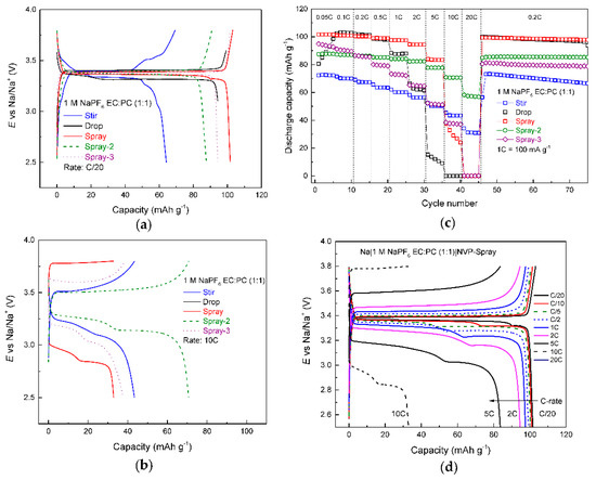 Data in Figure 3a indicate that NVP-stir has a staging charge profile and a lower capacity (64 mAh g−1), which is in good agreement with XRD data. Multiple impurities that could not be identified are present and will therefore lower the gravimetric capacity of the material. All the other materials display very flat plateaus, some staging during discharge can be observed, explained by parasitic oxidation reactions on the surface of the sodium counter electrode [34]. NVP-spray displays the highest capacity—102 mAh g−1 at C/20—followed by NVP-drop and NVP-spray-3 (scaled up version of NVP-spray, but without added glucose) at 94 mAh g−1 and NVP-spray-2 at 88 mAh g−1. However, the order reverses at 10 C (Figure 3b), where NVP-spray-2 exhibits the best performance (70 mAh g−1) and NVP-drop the worst, reaching the cut-off voltage too early due to high IR-drop. The fact that NVP-spray-3 and NVP-spray-2 show high capacities at 10 C can be attributed to increased carbon content in the electrode material.