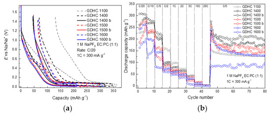 Therefore, based on literature data [40], GDHCs were heat treated at higher temperatures (1400–1600 °C). The charge/discharge profiles in Figure 4a follow a logical order—with increasing temperature, both irreversible capacity and sloping area are reduced. However, plateau capacities also reduce which lowers 1st cycle coulombic efficiency (CE). By limiting the Super P in all electrodes, irreversible capacity is reduced from 66 mAh g−1 to 47 mAh g−1 and sloping region is reduced by 30 mAh g−1. Unfortunately, the plateau capacity is also reduced when Super P content is decreased from 15 wt % to 4 wt %. As shown in Figure 4b, the best overall performance is achieved with GDHC 1400 b (reduced Super P content). Higher plateau capacity, but similar irreversible capacity compared to higher temperatures yields a 1st cycle CE of 85%. Therefore, this carbon was chosen as the best candidate for full cell measurements.