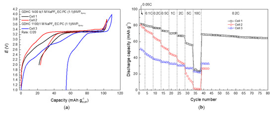 The electrode active materials were mixed with Super P (Alfa Aesar, Haverhill, MA, USA) and polyvinylidene difluoride (PVDF, MW = 534 000, Aldrich, St. Louis, MO, USA) in a 75:15:10 weight ratio and stirred overnight using N-methyl-2-pyrrolidone (NMP, Sigma-Aldrich, St. Louis, MO, USA, 99.5%) as the solvent. Some GDHC electrodes were prepared in 85:4:11, denoted as GDHC b. The resulting mixture was cast onto aluminum foil (MTI, thickness 15 µm) using the tape casting technique. The cast electrodes were dried under vacuum at 120 °C for 12 h. Electrode mass loadings were 1.6–1.8 mg cm−2 and 4.3–4.5 mg cm−2 for GDHC and NVP electrodes, respectively. The electrochemical performance was evaluated at 23 ± 0.5 °C in 2-electrode setup using coin cells (Hohsen, Tokyo, Japan, 2032) and sodium metal (99.8%, Acros, Morris Plains, NJ, USA) as the counter electrode. The following salt and solvents were used in the tested electrolytes: NaPF6 (99%, Alfa Aesar, Haverhill, MA, USA), ethylene carbonate (EC, 99%, Sigma-Aldrich) and propylene carbonate (PC, 99.7%, Sigma-Aldrich, St. Louis, MO, USA). EC and PC were mixed in 1:1 volume ratio. Measurements were carried out in 1 M NaPF6 EC:PC (1:1) solutions. Glass fiber separators (EL-Cell GmbH, Hamburg, Germany) with thicknesses 1.55 mm and 0.26 mm were used in half cell and full cell measurements, respectively. All test cells were assembled inside an Ar-filled glove box were O2 and H2O content was less than 0.1 ppm.