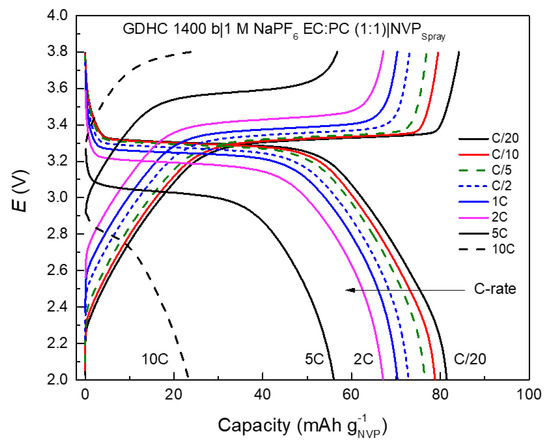 Charge/discharge profiles in Figure 6 are comprised of two distinct regions and the shape of the profile is mainly determined by the hard carbon profile since NVP has a very flat plateau. As the plateau capacity of the hard carbon is depleted the full cell profile follows the sloping behavior of the hard carbon. Capacities for cell 1 reach 80 mAh g−1 and 60 mAh g−1 for the plateau region per NVP active mass. Calculated energy density for the full cell at C/20 was 104 Wh dm−3 and specific energy 189 Wh kg−1. Cell 1 rate performance (Figure 6) is similar to NVP-spray in Figure 3d—capacity decline after 2 C with increased ohmic drop—which in turn caused specific energy drop from 150 Wh kg−1 (at 2 C) to 119 Wh kg−1 (at 5 C) and energy density drop from 82 Wh dm−3 (at 2 C) to 65 Wh dm−3 (at 5 C). Interestingly, no stages can be observed in discharge profiles unlike in NVP half cells, which again supports the claim that reactions on Na electrode can distort the signal that is assumed to come from the working electrode [34].
