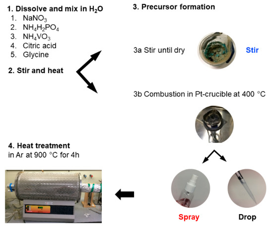 The resulting mixture was stirred and heated at 90 °C to remove excess water and produce a viscous gel. Three different approaches to form a precursor were employed from this point onward (Scheme 1). Option 1—the viscous solution was heated in the beaker until a soufflé-like foam was formed, denoted as NVP-stir. According to Wang et al. [31] a spontaneous combustion of the gel should have happened, but we did not observe such an effect. Option 2—the viscous solution was dropped onto a hot Pt-crucible (400 °C, heated with a natural gas flame), denoted as NVP-drop. Option 3—the viscous solution was sprayed onto the Pt-crucible using a bottle spray, denoted as NVP-spray. The precursor materials were thereafter ball-milled for 2 h at 300 rpm after which the mixture was heat-treated in a quartz tube furnace at 900 °C (ramp rate 10 °C min−1) under argon (grade 5.0, AS Eesti AGA, Tallinn, Estonia) flow (900 mL min−1) for 4 h. Efforts were made to scale up the synthesis and produce bigger batches of the material using the spray method. The first experiment was a scale-up of the NVP-spray method, denoted as spray-2 and the second was a slight modification of spray-2 in which no glucose was added to the precursor, denoted as spray-3.