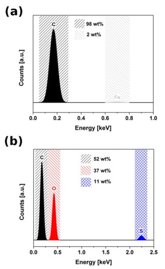 Acid treatment introduced ca. 37 wt% oxygen. Additionally, 11 wt% of sulfur, which is caused by contamination of oxidized CNT with strongly adsorbed sulfur-based chemical groups (most probably sulfate) introduced by sulfuric acid (could not be removed by the work-up despite copious amounts of distilled water used for filtration), was detected.