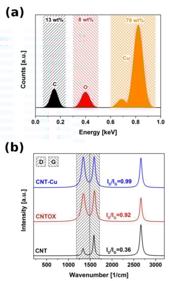EDX analysis showed 79 wt% Cu and 13 wt% C with the rest attributed to the residual oxygen groups from CNT functionalization and Cu precursor (