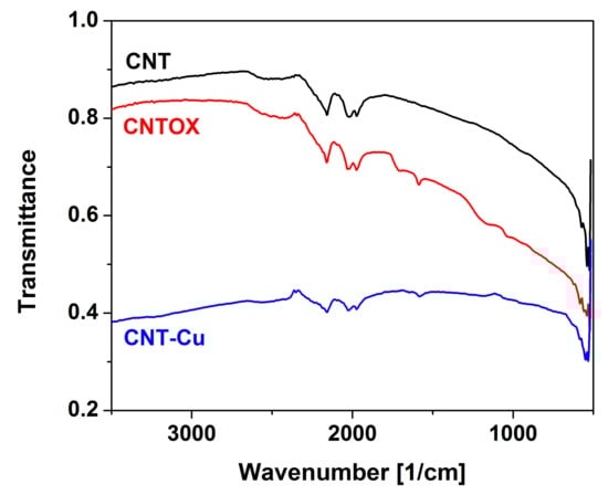 −1 ascribed to carbon structure were present in all three spectra, however, in the Cu-CNT composite they had the smallest intensities probably because of high copper loading. Not observable in this figure because of spectra overlapping was a broad and small signal located at 3500–3000 cm