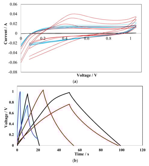 Figure 7a presents CV curves obtained for tested materials during 1000 charge discharge cycles at scan rate 500 mV/s in the potential window 0–1 V. In case of CNT curves were overlaid with the