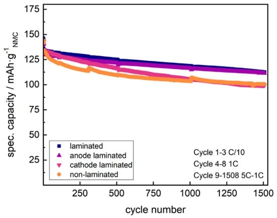 - Frankenberger, M.; Singh, M.; Dinter, A.; Jankowksy, S.; Schmidt, A.; Pettinger, K.-H. Laminated Lithium Ion Batteries with improved fast charging capability. J. Electroanal. Chem. 2019, 837, 151–158. [Google Scholar] [CrossRef]