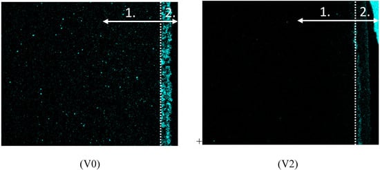 In addition to the assessment of the flying sparks, the recordings could strengthen the assumptions made in the previous sections concerning the formation of the plasma. A qualitative comparison of the images in Figure 14 showed that V0, V2, and V5 showed a clearly purple-colored plasma formation, whereas, for the other parameters—V3 and V4, the plasma presumably lied below the ablation gas phase, and thus was significantly smaller. This also explained why at shorter pulse lengths or higher pulse peak powers, the material removal and the formation of the HAZ at a constant energy density was greater.
