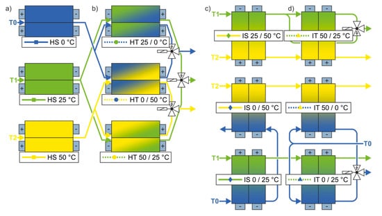 Three temperature levels (0 °C, 25 °C, and 50 °C) were chosen as reference values, between which the gradients and transients are generated. The reference setups, in which the cells were cycled under homogenous and steady (HS) temperature are shown in Figure 1a. The setups shown in Figure 1c are characterized by an imposed temperature gradient over the length of the cells’ electrode stack that was kept constant during electric cycling (inhomogeneous, steady setup (IS)). The transient setups in which the temperatures change during the charge and discharge processes are shown in Figure 1b,d. In those cases, either the temperature that was applied to the entire cell surface changed with time (homogeneous, transient setup (HT)) or a temperature gradient developed and declined, caused by a time dependent change in temperature at the side of the cells’ anode tabs (inhomogeneous, transient setup (IT)). Thermal and electrical cycles were superimposed and synchronized.
