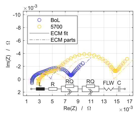 Two exemplary results of the ECM fitted to the measurement data as well as the individual contributions of each element in the frequency domain are shown in Figure 2 for measurements at BoL as well as after 5700 theoretical cycles.